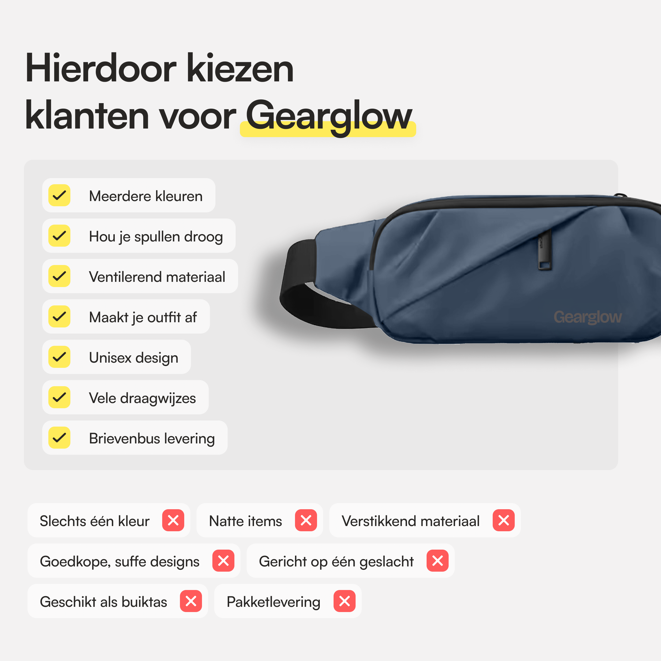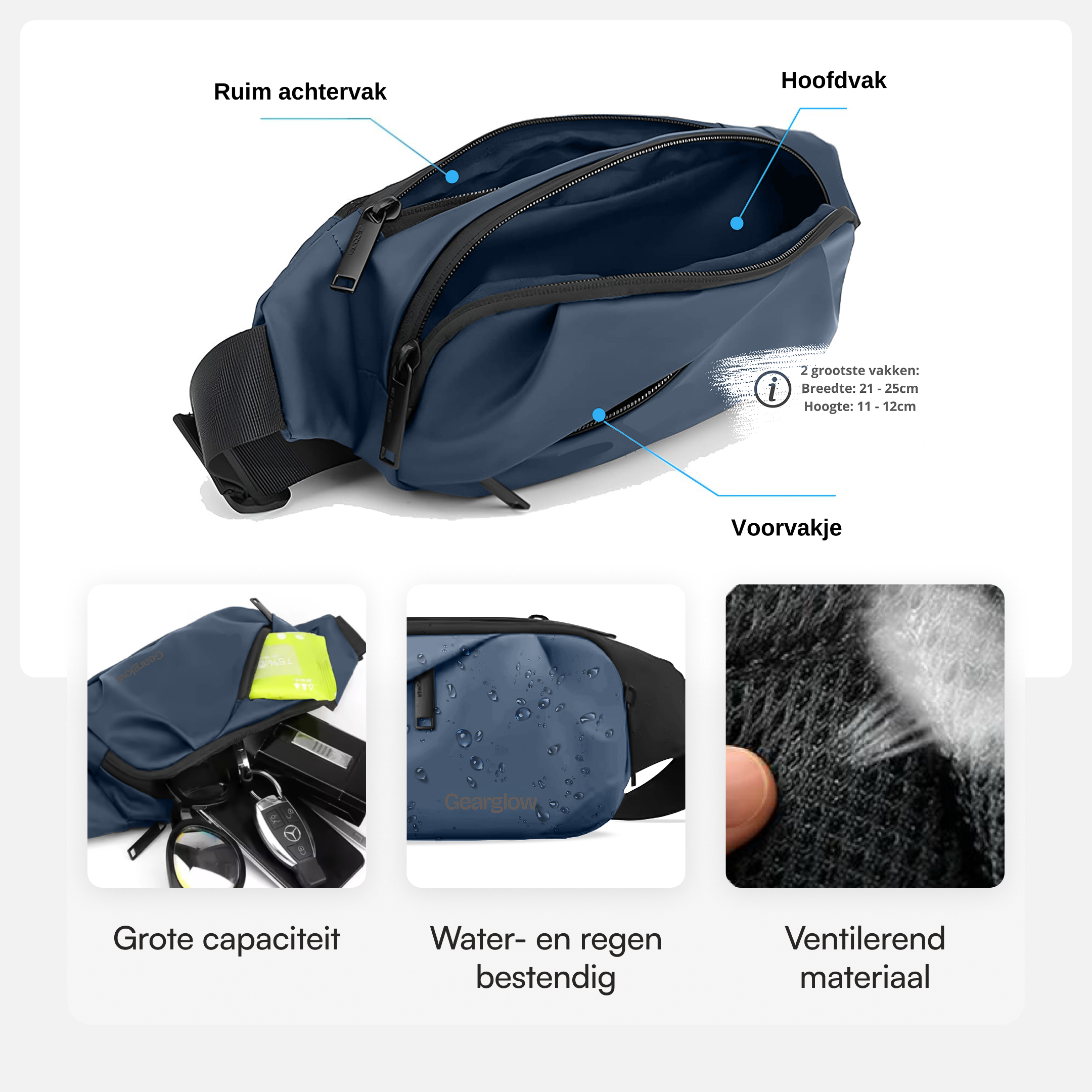 Op zoek naar een heuptas die alles meeneemt zonder in de weg te zitten? De GearGlow® Heuptas is licht, waterdicht en verrassend ruim. Zet hem strak of losjes, draag hem zoals jij wilt en houd je essentials altijd binnen handbereik. Perfect voor dagelijks gebruik, citytrips en festivals. Welke kleur is jouw favoriet?
