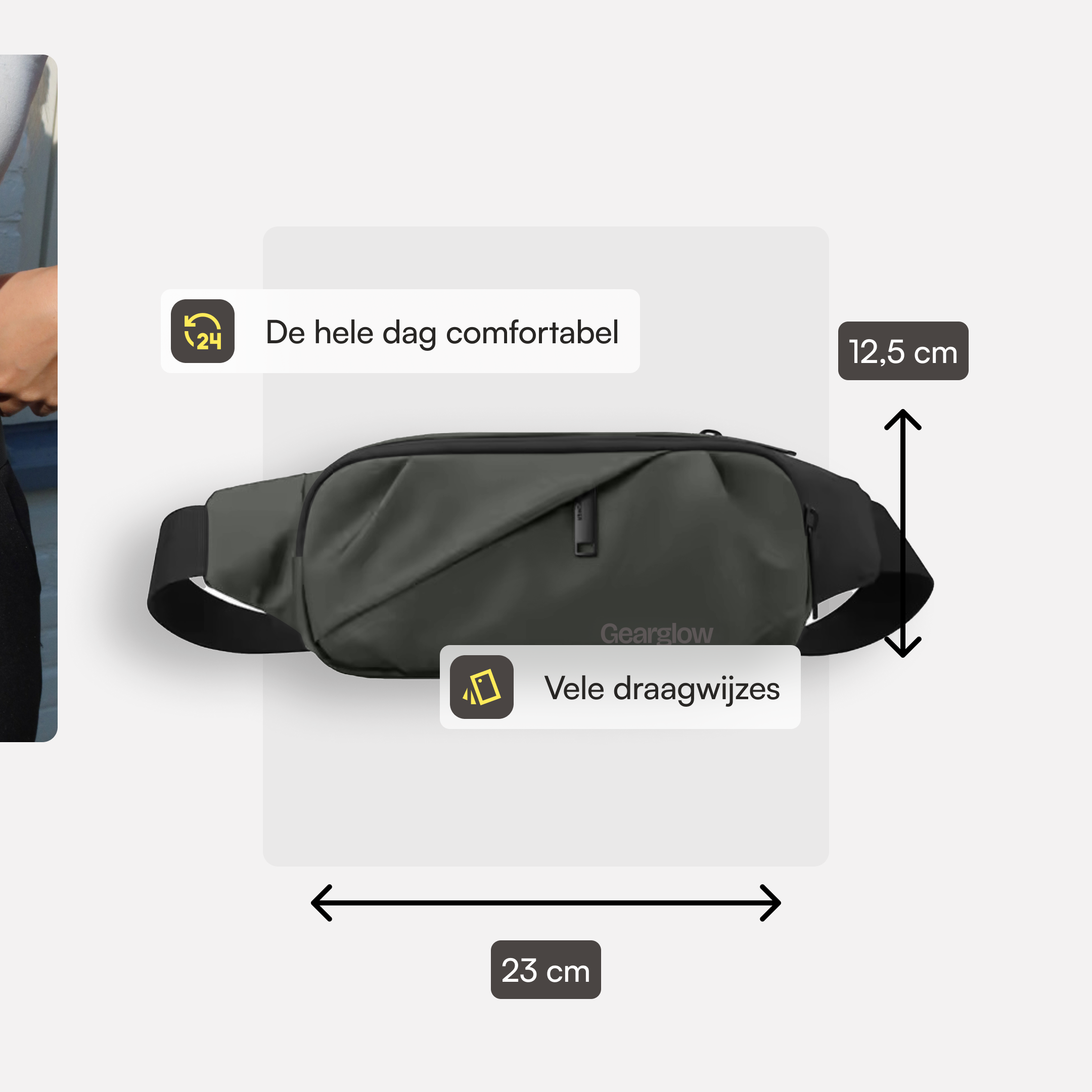 • Draagopties: heuptas, crossbody, sling of buideltas