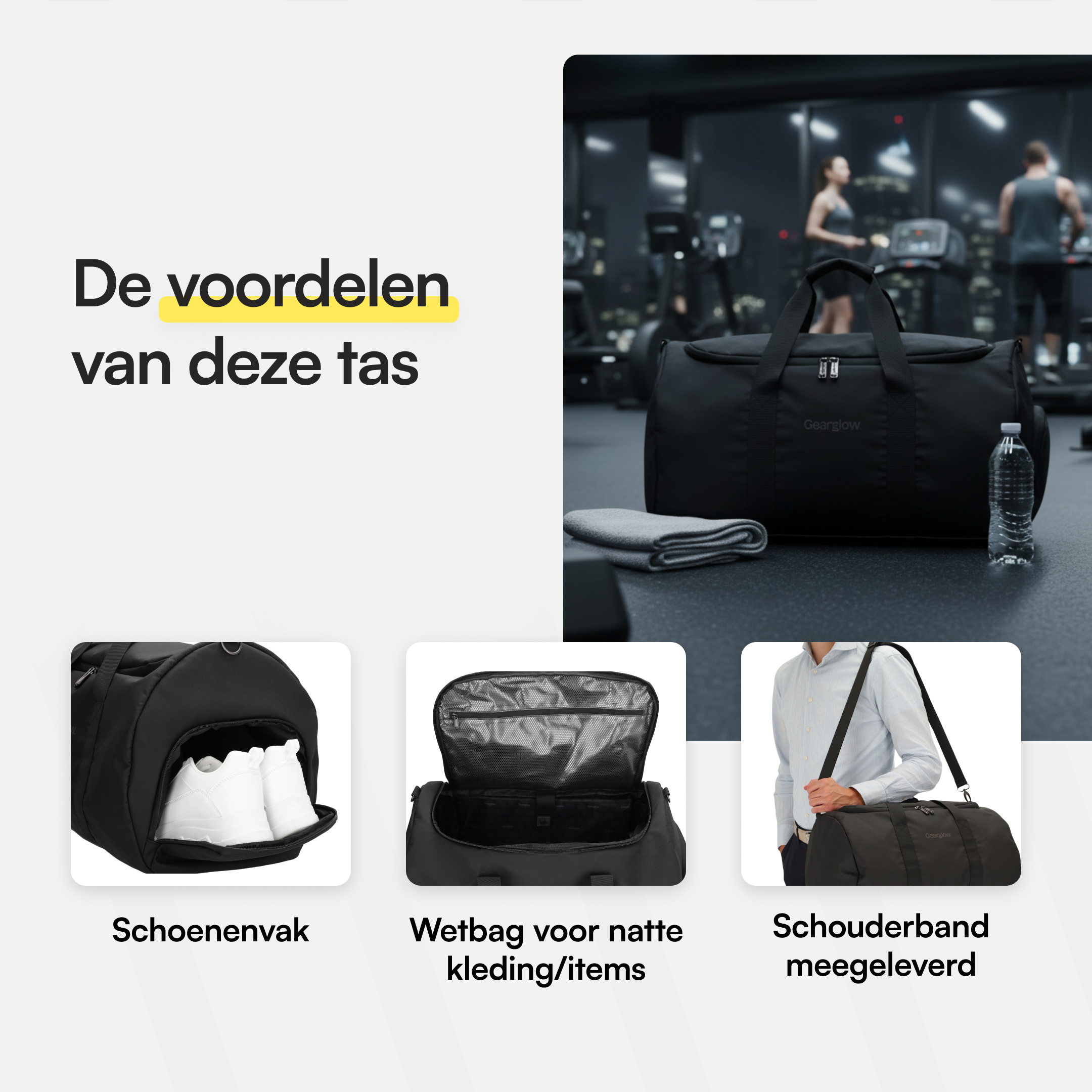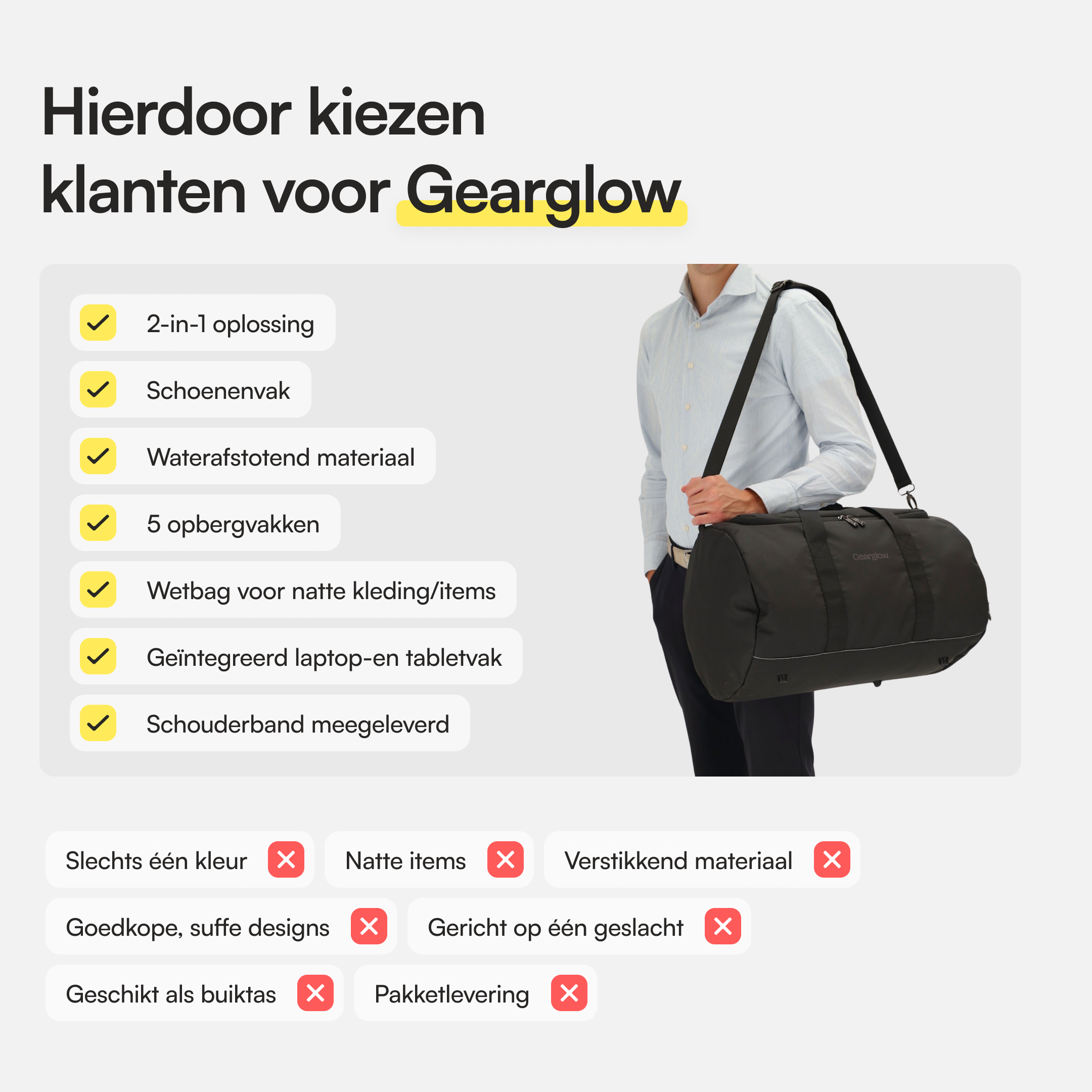 - 2-in-1 oplossing: Eén tas die dienstdoet als sporttas en weekendtas, zodat je geen aparte tassen meer nodig hebt.