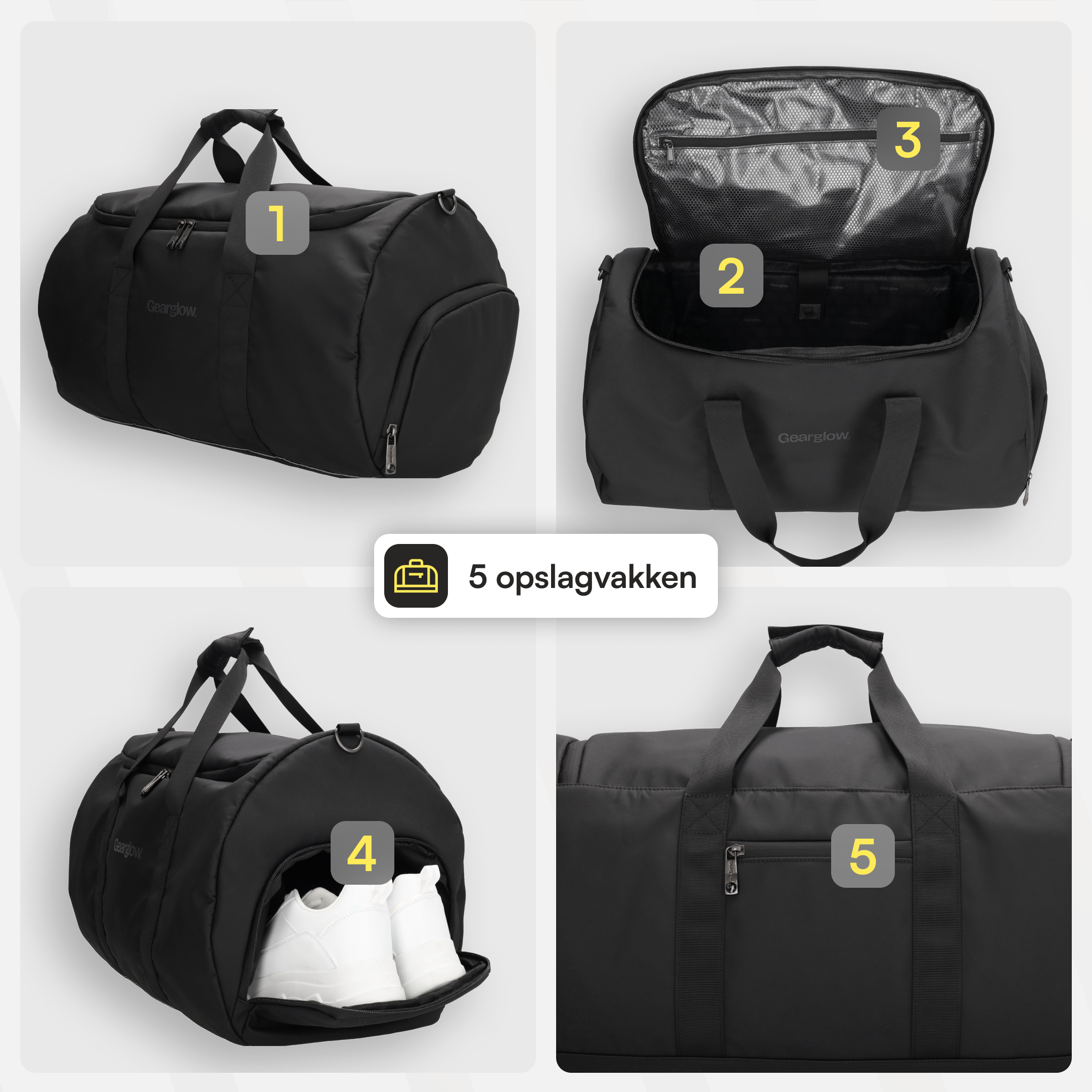 - 5 opslagvakken: Hoofdvak, schoenenvak, wetbag, extra binnenvak en ritsvak aan de buitenzijde voor sleutels, telefoon en andere essentials.